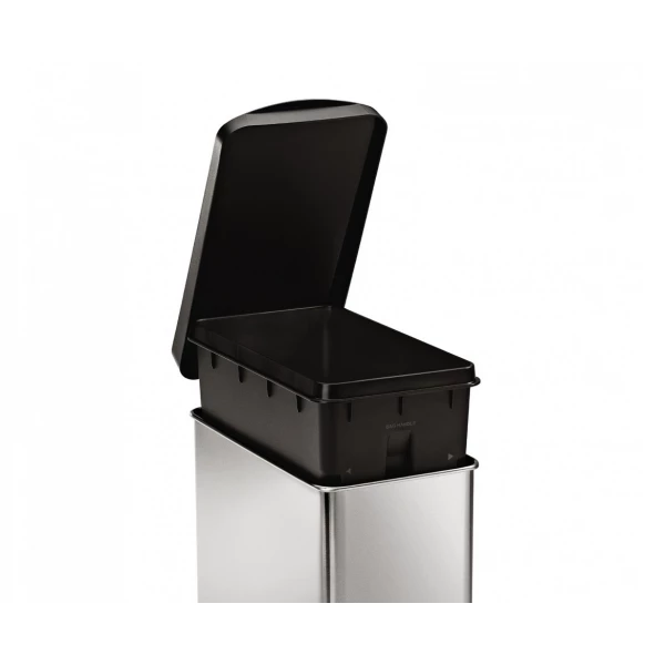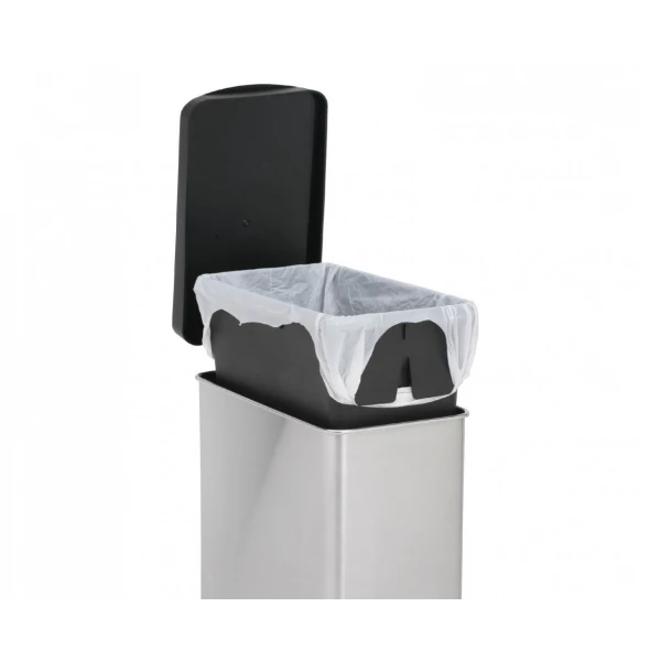 Урна оснащена прочной стальной педалью, рассчитанной на многолетнее использование. Педальный механизм обеспечивает гигиеничное и удобное открытие крышки без необходимости прикасаться к ней руками.
