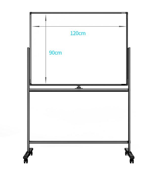 Габаритные размеры мобильной доски: 2120x1884x590 мм (ШxВxГ). Габаритные размеры вращающейся панели: 2000x1000 мм (ШxВ). Вес доски: 23.37 кг. Размер рабочей области: 1970x970 мм (ШxВ) x2 стороны. Ширина рамки панели: 15 мм.