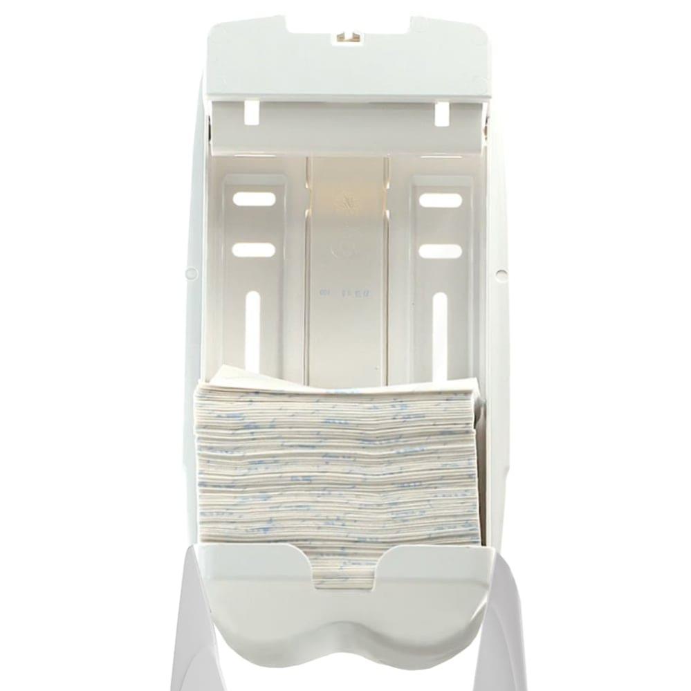 Диспенсер оснащён системой защиты от переполнения, которая облегчает процесс заправки, предотвращает застревание бумаги и способствует сокращению отходов. Контролируемая подача листов позволяет оптимизировать расход и снижать эксплуатационные затраты.