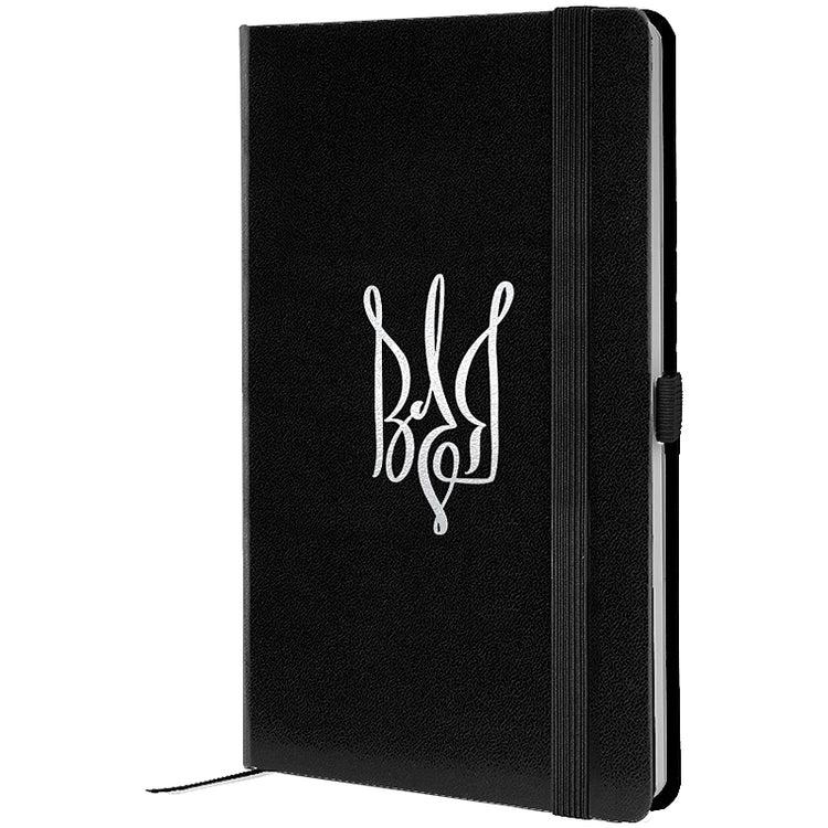 Размер записной книги: 136х207 мм (почти А5). Данный блокнот выполнен в твёрдой обложке с ламинацией Soft Touch и полиграфическими эффектами: выборочный структурный или УФ лак (в зависимости от цвета) и тиснение фольгой, имеет закругленные углы блока и обложки, а также продольную резинку для фиксации блокнота в закрытом состоянии и петельку-резинку для ручки в тон дизайна обложки.