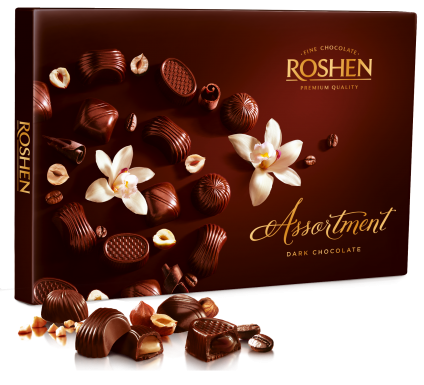Конфеты Roshen Assortment Elegant в коробке. Ассортимент включает разнообразные вкусы и текстуры, выполненные по классической рецептуре с изысканным оформлением. Каждая конфета обладает насыщенным и гармоничным вкусом, идеально подходящим для подарка или уютного чаепития.