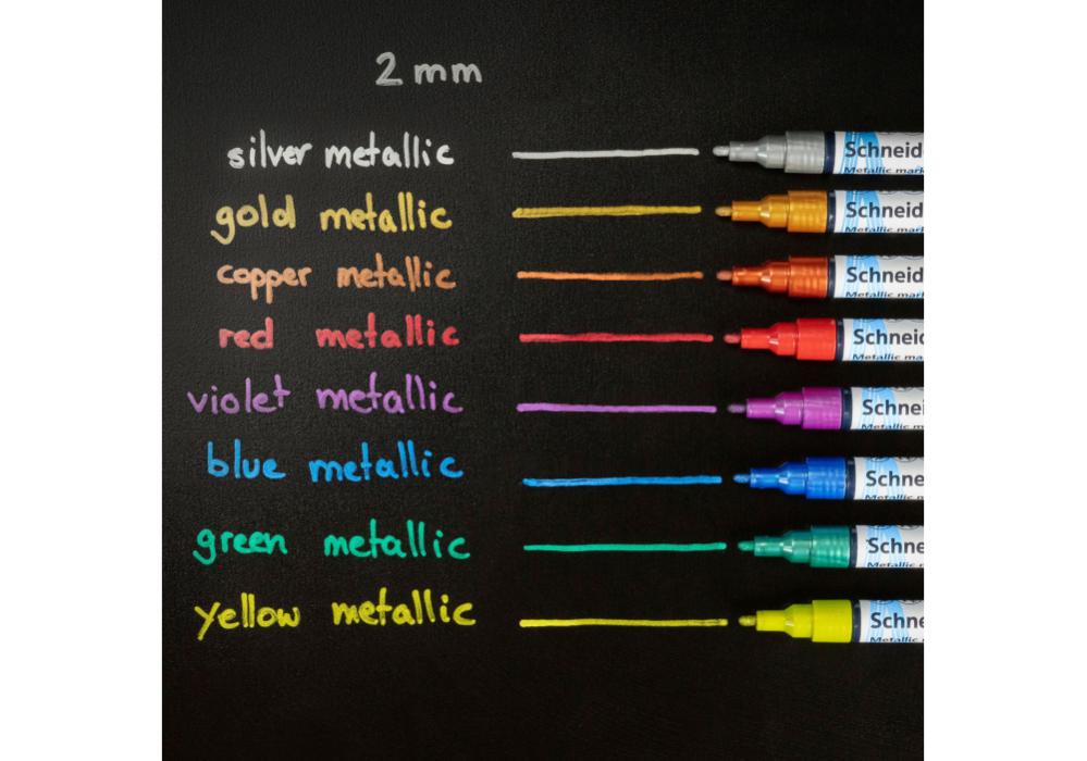 Металлический маркер создан для получения ярких декоративных эффектов и надання проєктам унікального металлизированного блеска. Благодаря инновационной формуле чернил вони наносятся ровно, чисто і утворюють однородне металлическое покрытие без пропусков. Особые алюминиевые частички, покрытые цветными пигментами, отражают свет под разными углами, создавая дуже сильный блеск даже при слабом освещении.