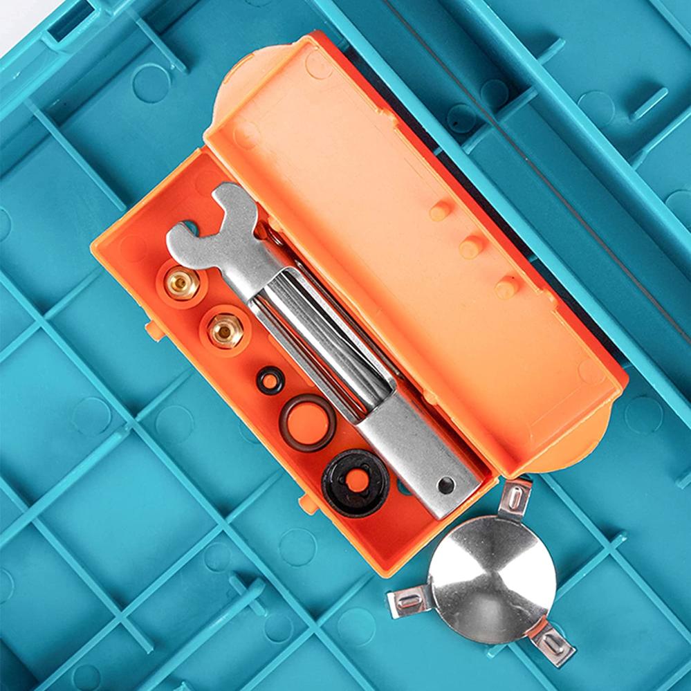 В комплект входит алюминиевый насос, силуминовая помпа, топливный баллон объемом 450 мл, шланг длиной около 270 мм. Все элементы аккуратно размещаются в фирменном жестком кейсе яркого голубого цвета, который защищает аксессуары от повреждений при транспортировке. Вес горелки — 501 г.