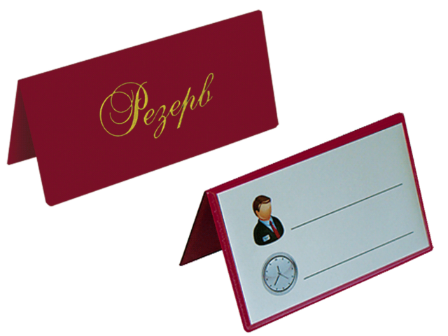 Таблички "резерв стола" станут акцентом в фирменном стиле ресторана. Они отлично подчеркнут «настроение» помещения и проводимых там мероприятий, станет визитной карточкой – привлекательной, без излишеств, и свидетельством качества: от сервировки стола до обслуживания. Двухсторонняя табличка. На лицевой стороне надпись «Резерв». На обратной стороне карточка с покрытием из поливинилхлорида, для указания имени и времени резерва. Надписи можно делать маркером для сухостираемой доски, затем надпись легко стирается губкой. Изготовлена из винила «под кожу». Размер: 70х155 мм.105 грн штАртикул: 0300-0073-Купить -