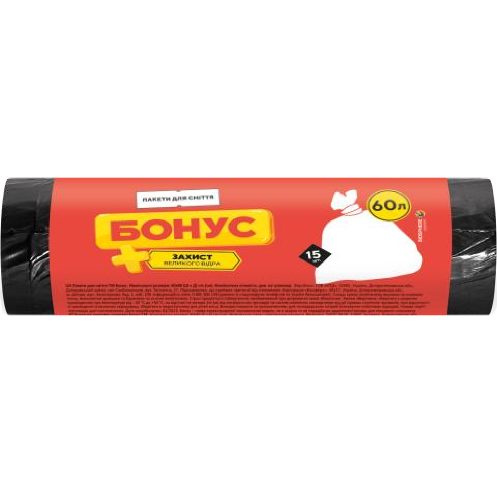 Пакеты для мусора ТМ Бонус предназначены для хозяйственных целей: упаковки, хранения, транспортировки непищевых продуктов и сбора мусора. Подходят для нестандартных или больших мусорных ведер. Изготовлены из переработанного пластика. Материал — полиэтилен. Объем пакета составляет 60 л. Толщина — 8,5 мкм. Размер — 60 x 80 см. В упаковке — 15 шт.