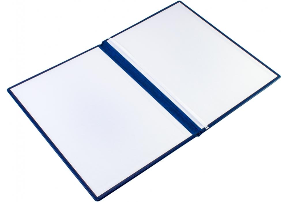 Папка формата А4 выполнена с обложкой из искусственной кожи. Внутренняя вклейка изготовлена из белой бумаги. Модель оснащена лентой-держателем для фиксации документов. Тиснение отсутствует. По периметру папки выполнена прошивка, которая повышает прочность конструкции и аккуратность внешнего вида.