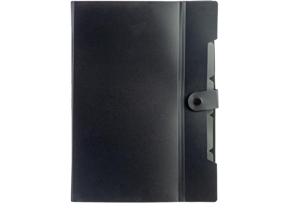 Папка-конверт формата A4 с расширением оснащена удобной застёжкой-кнопкой и шестью внутренними разделителями. Снаружи изделие выполнено в строгом чёрном цвете, а внутри имеет цветные вкладки-разделители, которые помогают легко систематизировать документы.