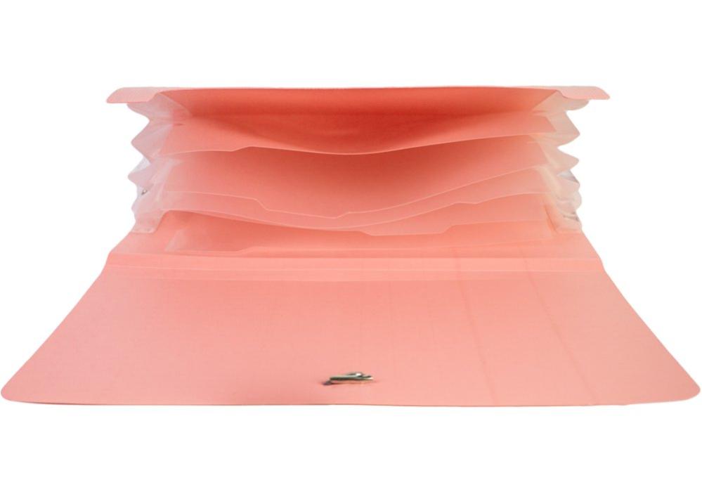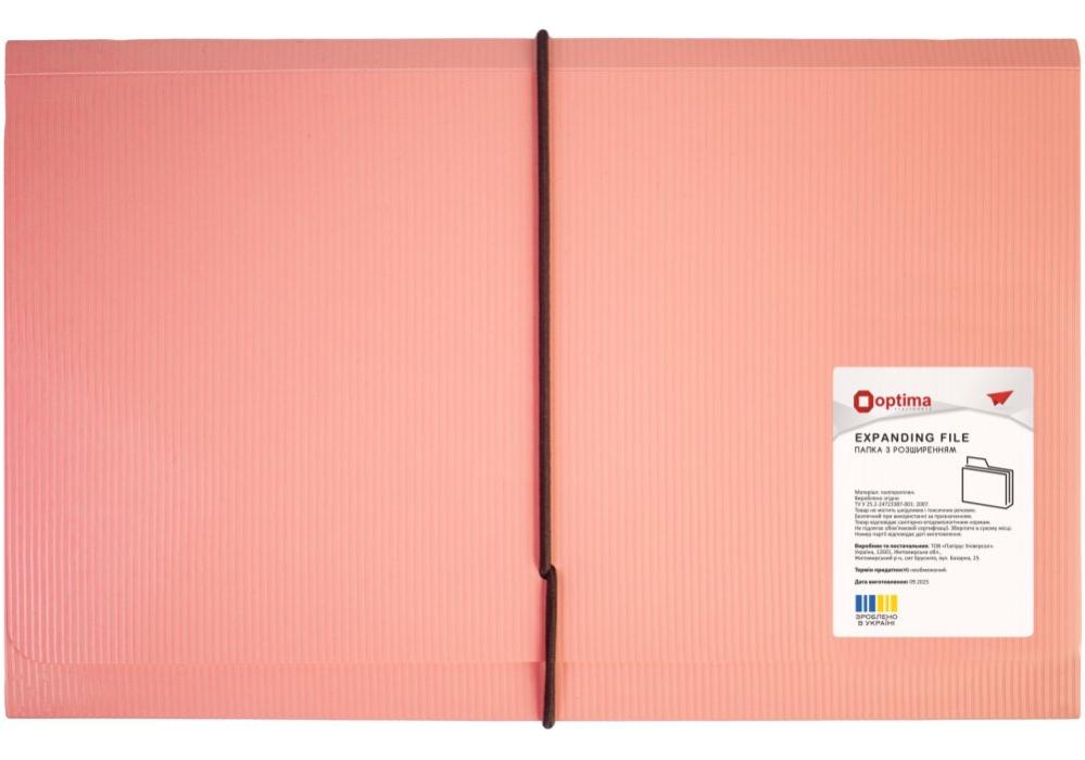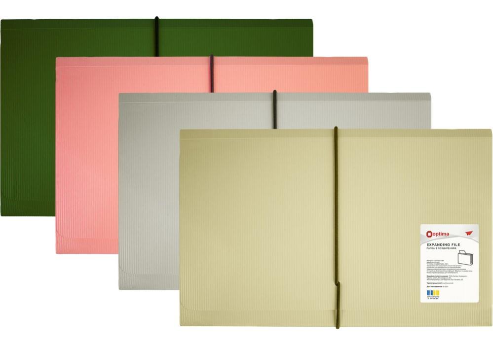 Папка с расширением формата А5 OPTIMA предназначена для удобного хранения и систематизации документов небольшого формата. Изготовлена из прочного пластика толщиной 600 мкм с фактурой «СМУГА», устойчивой к износу и механическим повреждениям. Расширяемая конструкция позволяет размещать увеличенный объем бумаг без заломов и деформации. Цвета: коралловый, какао, хаки, серый.