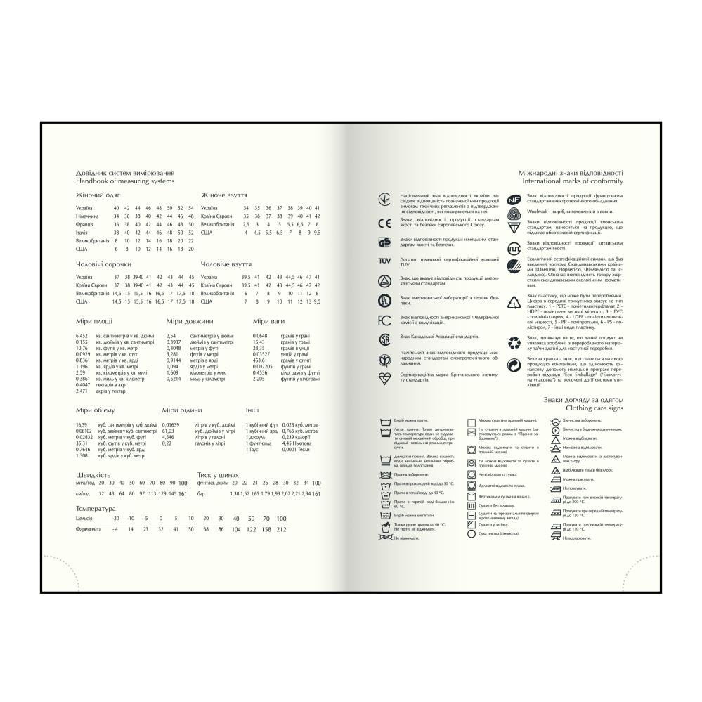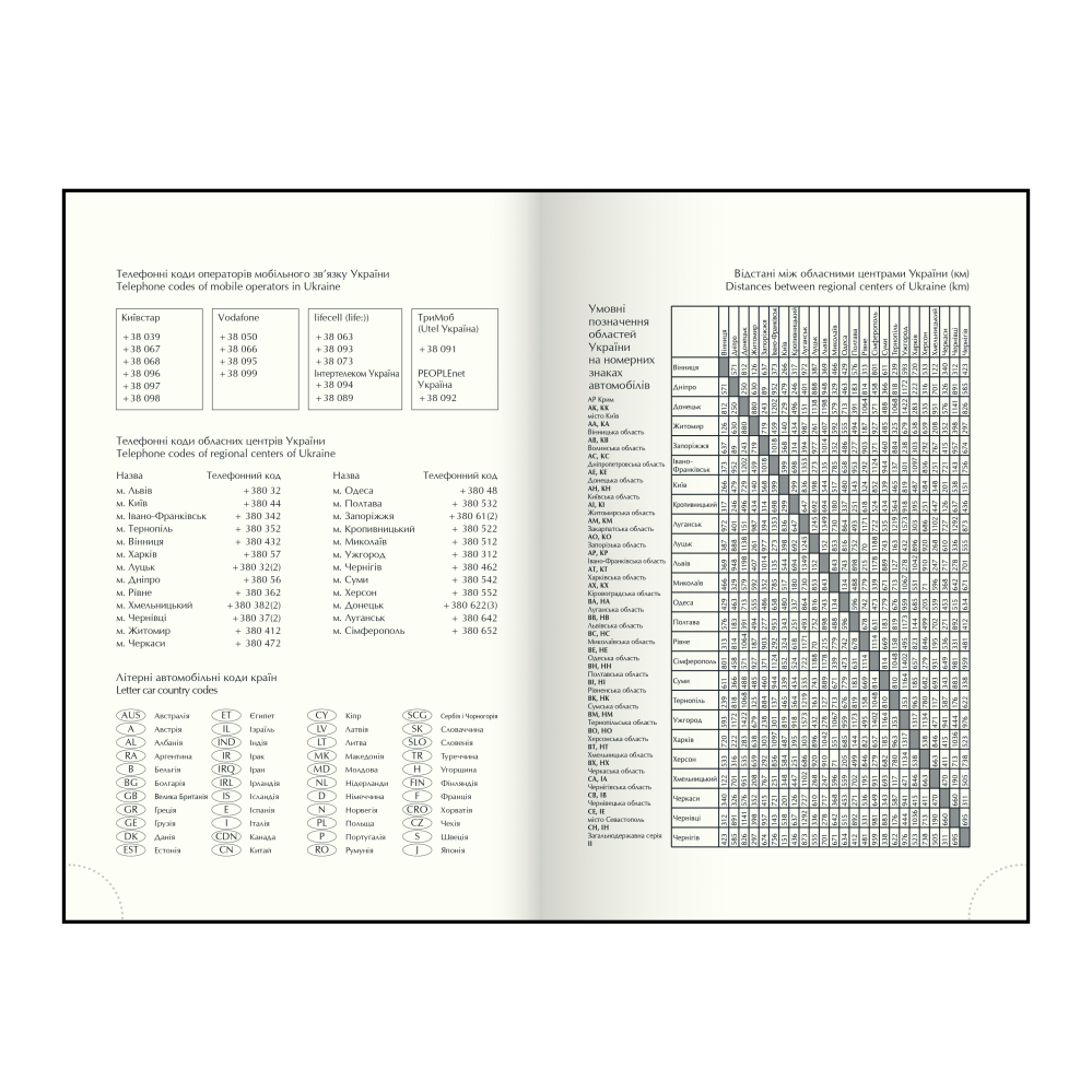 Информационно-справочный раздел: телефонные коды операторов и областей Украины, автомобильные коды стран, таблица расстояний, системы измерений, знаки ухода за одеждой.