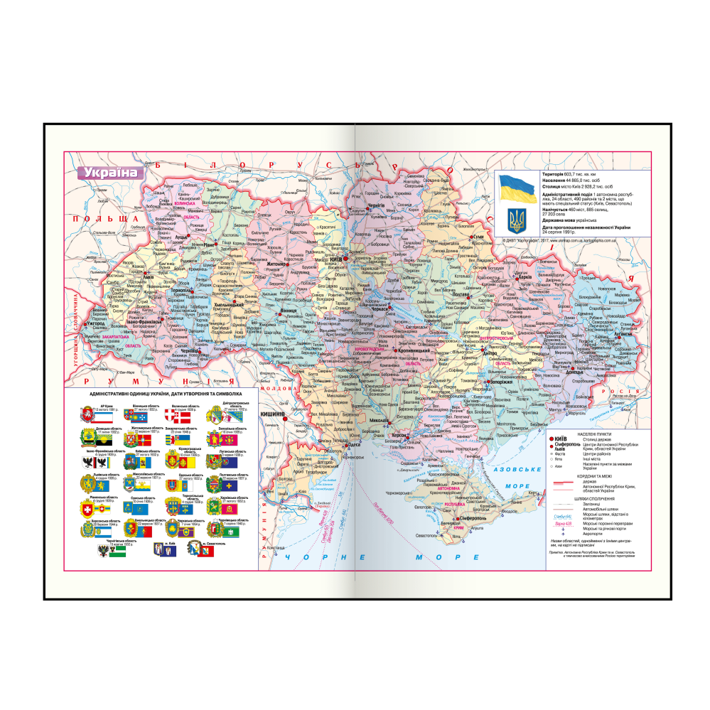 Формат — А4, 288 страниц. Внутренний блок изготовлен из кремовой офсетной бумаги плотностью 70 г/м2. Закладка-ляссе в цвет обложки обеспечивает удобство поиска нужной страницы. На форзацах размещены карты Украины и Европы. Упаковка — индивидуальная картонная коробка.