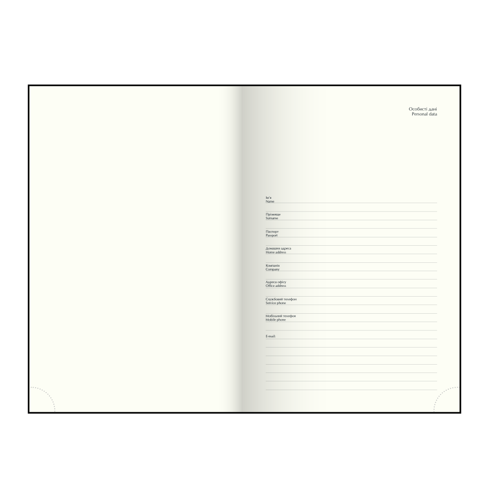 Формат А5, 336 страниц. Внутренний блок выполнен из кремовой офсетной бумаги плотностью 70 г/м2. Предусмотрены перфорированные уголки листов, закладка-ляссе в цвет обложки и карты Украины и Европы на форзацах. Ежедневник упакован в индивидуальную картонную коробку.