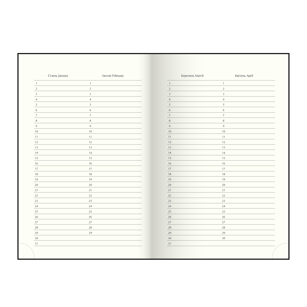 Формат А5, 336 страниц. Гибкая обложка из искусственной кожи обеспечивает долговечность и комфорт в использовании. Внутренний блок выполнен из кремовой офсетной бумаги плотностью 70 г/м2. Перфорированные уголки листов, закладка-ляссе в цвет обложки и карты Украины и Европы на форзацах делают ежедневник удобным и функциональным. Упаковка — индивидуальная, картонная коробка.