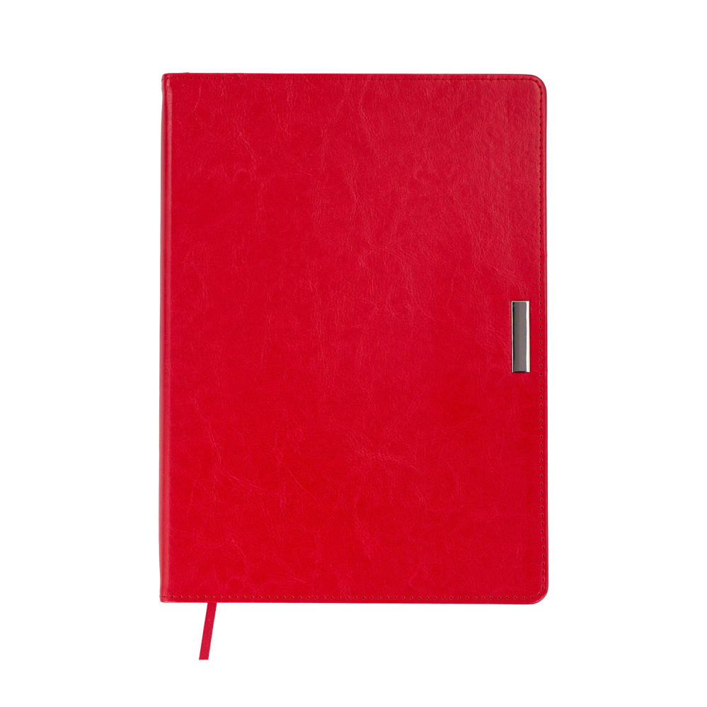 Гибкая обложка выполнена из искусственной кожи с фактурой под натуральную. Уникальной деталью дизайна является металлический декоративный элемент — стильная табличка на лицевой стороне обложки. Образ гармонично дополняют декоративный шов по периметру и тонированный срез внутреннего блока, выполненный в цвет обложки.