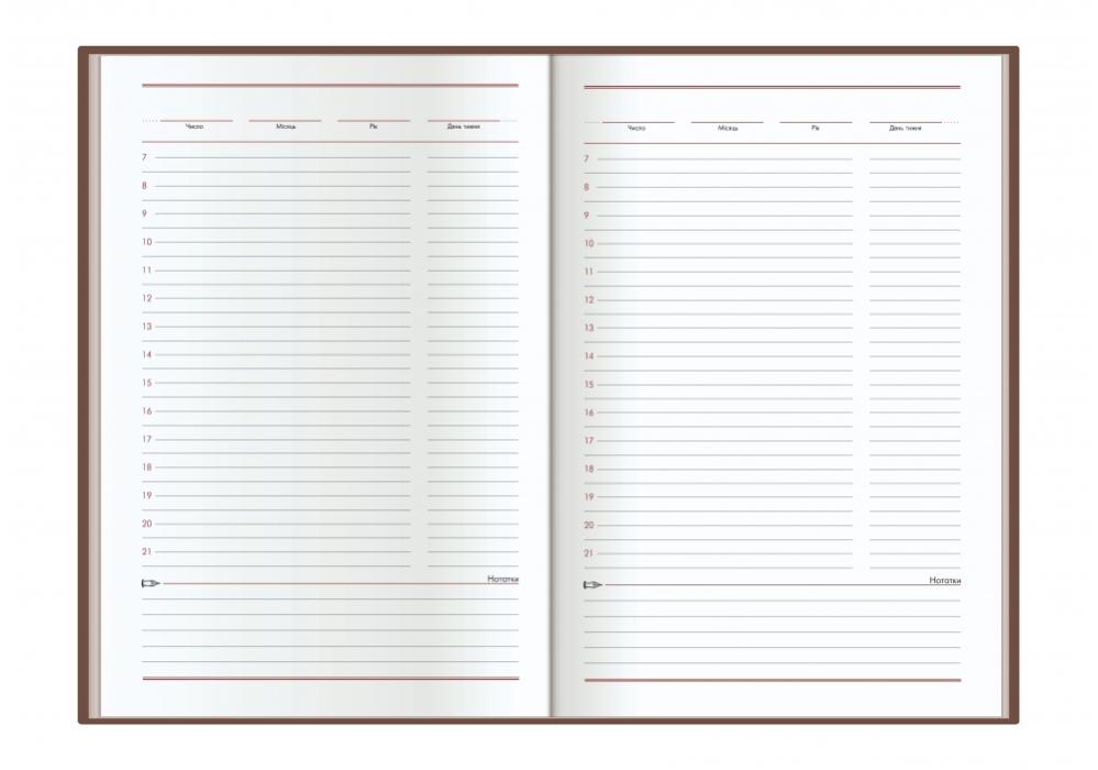 Формат А5, 336 страниц. Внутренний блок выполнен из кремовой офсетной бумаги плотностью 70 г/м2, печать — в сером и бордовом цветах. Перфорированные уголки позволяют легко находить актуальные страницы, а закладка-ляссе обеспечивает удобство в использовании. Блок двухъязычный — украинский и английский. На форзацах размещены карты Украины и Европы. Упаковка — индивидуальная, в картонной коробке.