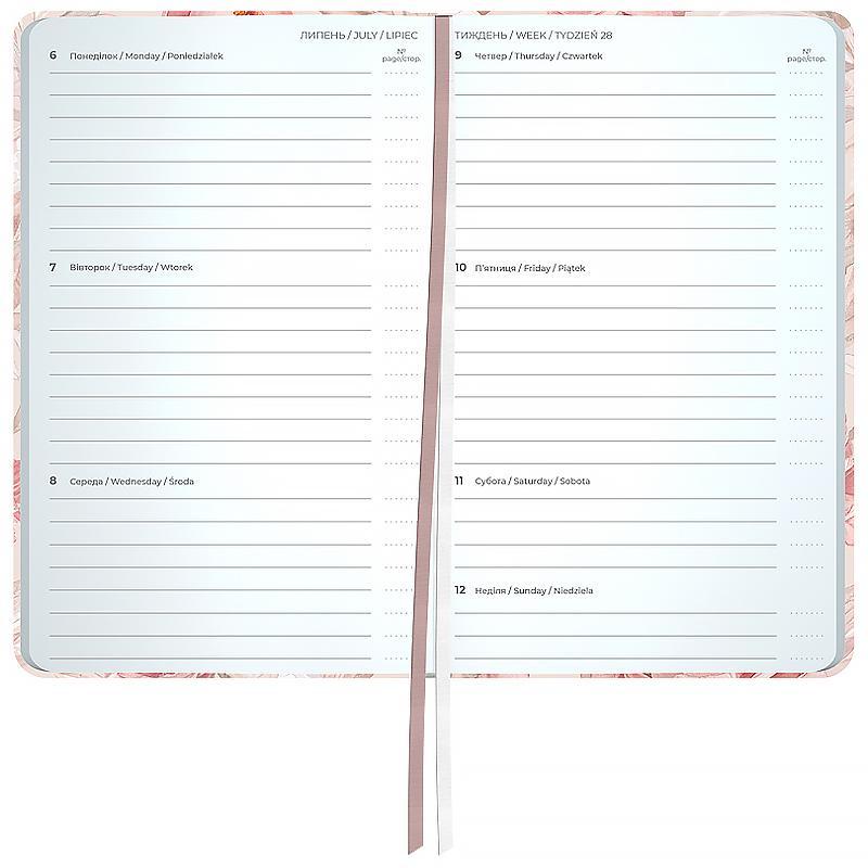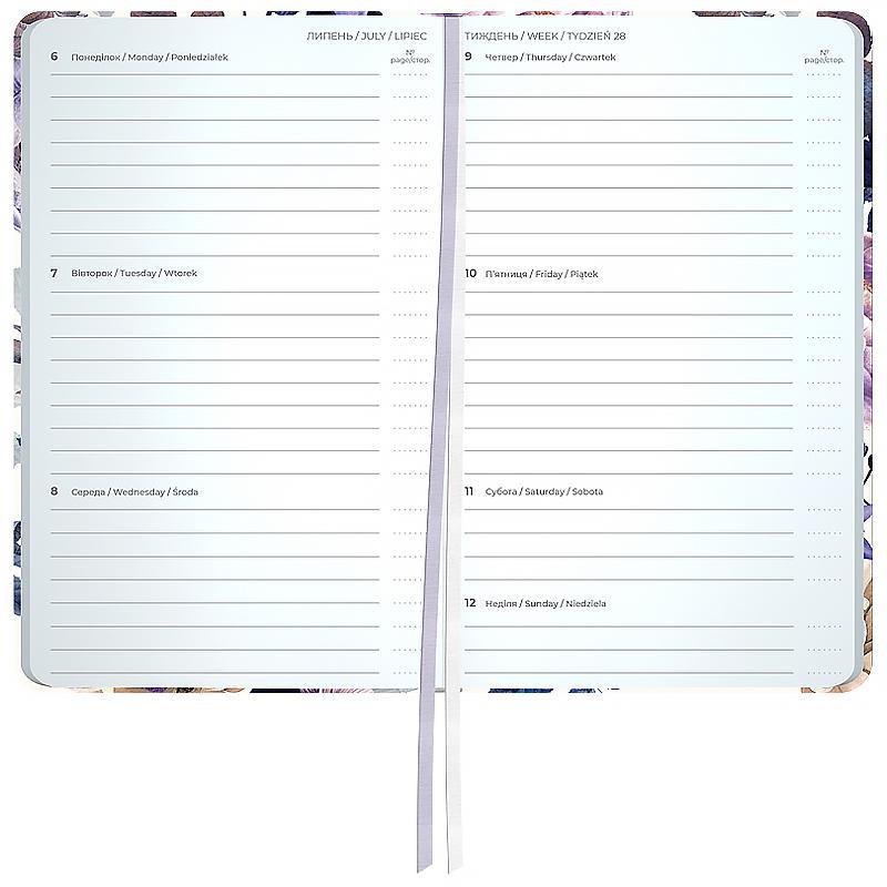 Еженедельник состоит из двух частей: датированный блок в линейку для планирования по неделям и дополнительные страницы в клетку для личных заметок.
