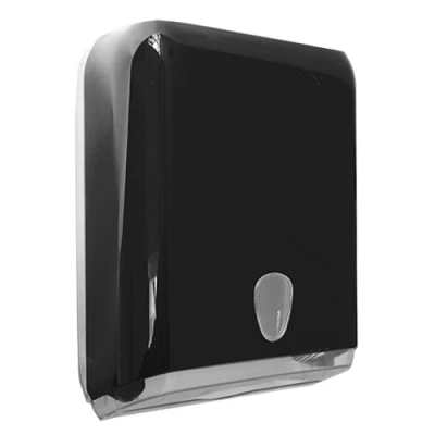 Держатель бумажных полотенец PRESTIGE выполнен в узком корпусе, благодаря чему выглядит стильно и компактно. При этом диспенсер остается вместительным и надежным — рассчитан на размещение двух пачек бумажных полотенец. Габаритные размеры изделия составляют 375x280x130 мм. Корпус изготовлен из высокопрочного пластика черного цвета. Предназначен для использования полотенец в пачках формата V-складки. Смотровое окно в форме капли позволяет контролировать наличие бумаги в диспенсере. Замок расположен в верхней части корпуса, что обеспечивает удобную и быструю дозаправку расходных материалов.