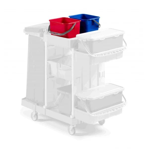Відро доступне у червоному, синьому, жовтому та зеленому кольорах, що дозволяє легко організовувати кольорове кодування інвентарю відповідно до санітарних стандартів. Модель зручна у використанні на професійних прибиральних візках серій MAGIC LINE, GREEN LINE, MODULAR, забезпечуючи ефективність та комфорт під час роботи.