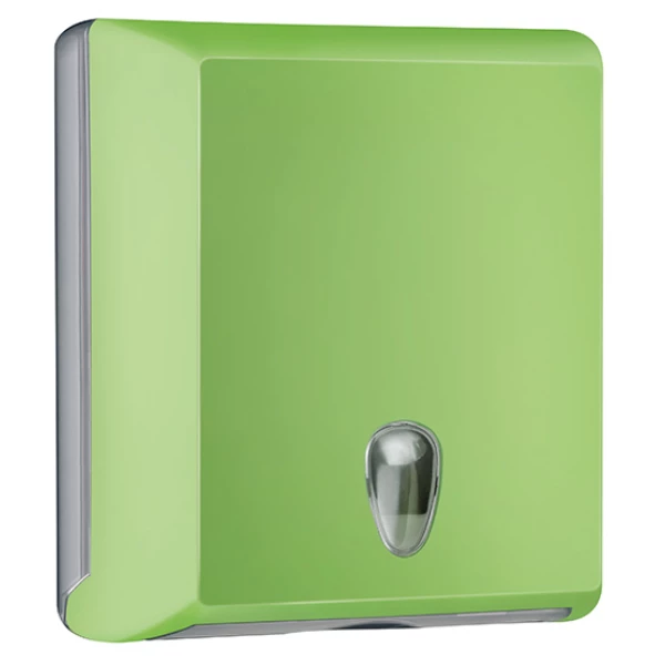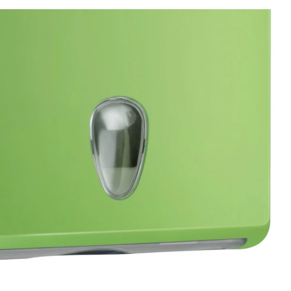 Тримач паперових рушників COLORED призначений для листових паперових рушників V-складання. Корпус виготовлений із високоміцного пластику з покриттям зеленою фарбою «Soft Touch», що створює ефект прогумованої поверхні та забезпечує додатковий захист від пошкоджень. Габаритні розміри виробу — 300x105x290 мм. Місткість — до 250 аркушів. Конструкція проста в обслуговуванні: бічне відкривання кришки дозволяє легко виконувати перезаправку. Тримач зачиняється на ключ. Оглядове віконце у формі краплі дає змогу контролювати наявність рушників у дозаторі. Рекомендується використовувати разом з обладнанням серії COLORED.