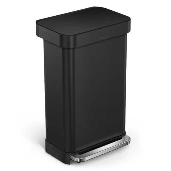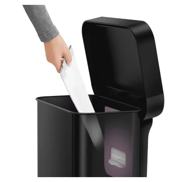 Відро з педаллю прямокутної форми виготовлене з високоякісної нержавіючої сталі та поєднує стильний дизайн, практичність і продуману конструкцію. Родзинкою моделі є вбудована кишеня для запасних сміттєвих пакетів, що дозволяє швидко та зручно їх замінювати — пакети завжди поруч.