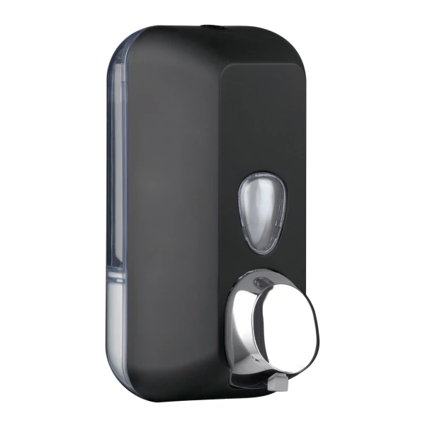 Дозатор пінного мила призначений для використання з картриджами об’ємом 0,5 л. Корпус виготовлений з ударостійкого пластику та покритий чорним шаром Soft Touch, який забезпечує додатковий захист, приємний «прогумований» тактильний ефект і підвищену стійкість до пошкоджень.