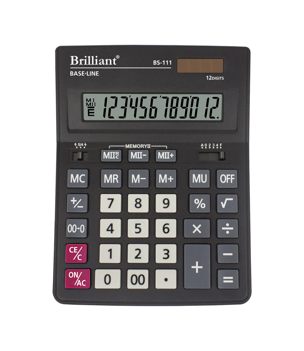 Настільний калькулятор Brilliant - функціональна та надійна модель для офісу, бухгалтерії, магазинів та будь-яких завдань, що потребують точних обчислень. Відрізняється розширеним набором клавіш, великим дисплеєм та зручністю роботи. 12-розрядний однорядковий дисплей – підходить для розрахунків із великими числами. Дворівнева пам'ять дозволяє зберігати та використовувати два проміжні значення. Клавіша зміни знака швидкий перехід між позитивним та негативним числом. Кнопка "підвищення ціни" зручна під час торгових операцій (націнка, перерахунок вартості). Клавіша відсотка миттєві обчислення знижок та пропорцій. Кнопка квадратного кореня для швидких математичних операцій. Клавіша подвійного нуля прискорює введення довгих чисел. Клавіша видалення останньої цифри виправляє помилку без скидання всього значення. MU (торгова націнка) професійна функція для розрахунку прибутку та остаточної ціни. Перемикач кількості знаків після коми налаштування точності обчислень. Перемикач режиму округлення автоматичний вибір потрібного варіанта округлення. Захист від залипання клавіш довговічність та стабільно комфортна робота. Автоматичне відключення економія заряду при простої.