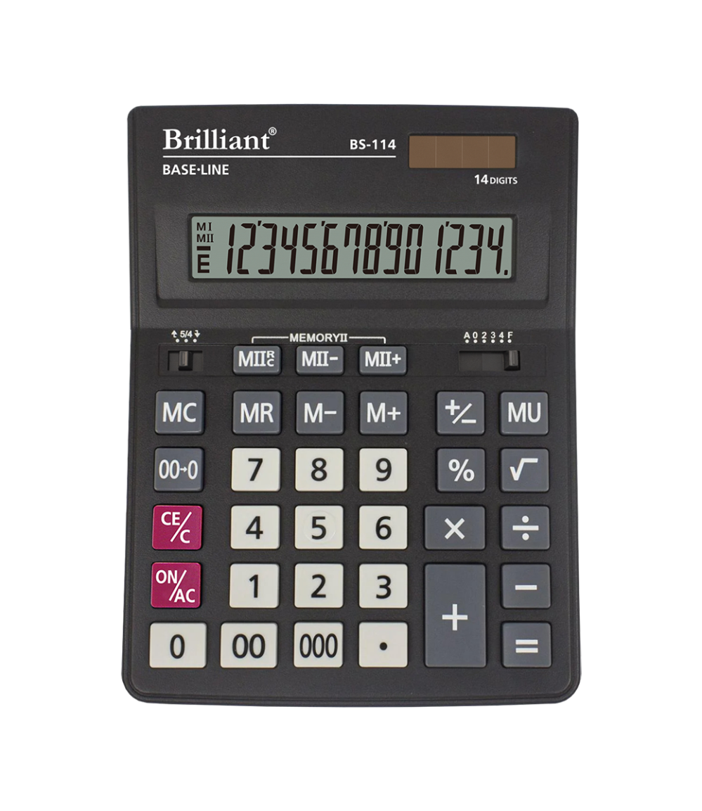 Настільний калькулятор Brilliant — це професійний інструмент для офісної роботи, бухгалтерії, сфери торгівлі та будь-яких фінансових розрахунків. Модель оснащена великим 14-розрядним дисплеєм, що забезпечує зручність під час роботи з великими числами. Дворівнева пам’ять дозволяє зберігати проміжні результати та значно пришвидшує виконання складних операцій. Функція зміни знака дозволяє легко перемикатися між позитивними та негативними значеннями, а кнопка відсотків допомагає швидко розраховувати знижки, пропорції та націнки.