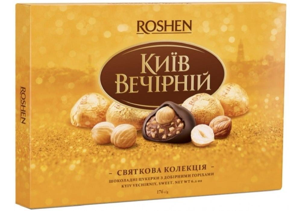 Цукерки Roshen «Київ вечірній» — це класичне праліне з подрібненим фундуком і цілим лісовим горіхом у шоколадній глазурі. Поєднання горіхової начинки та шоколаду формує традиційний смак продукту.