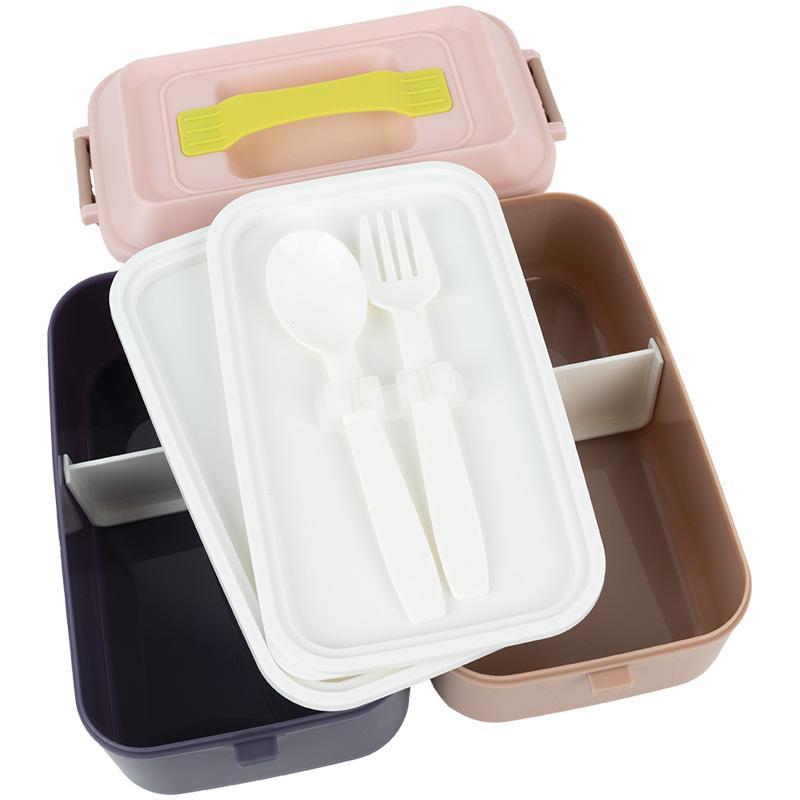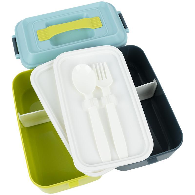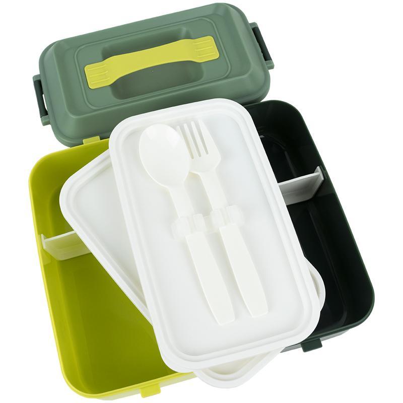 Усередині — два просторих відділення, кожне має додаткову кришку для поділу страв. У комплекті є пластикова ложка та виделка, що зручно фіксуються всередині.