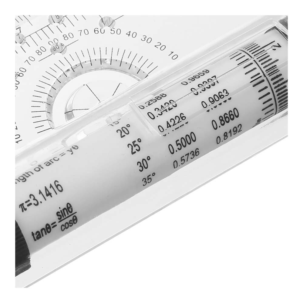 Пластиковий ролик має рельєфні накладки на кінцях, що запобігають ковзанню лінійки на поверхні. Вбудований транспортир розширює функціональні можливості.