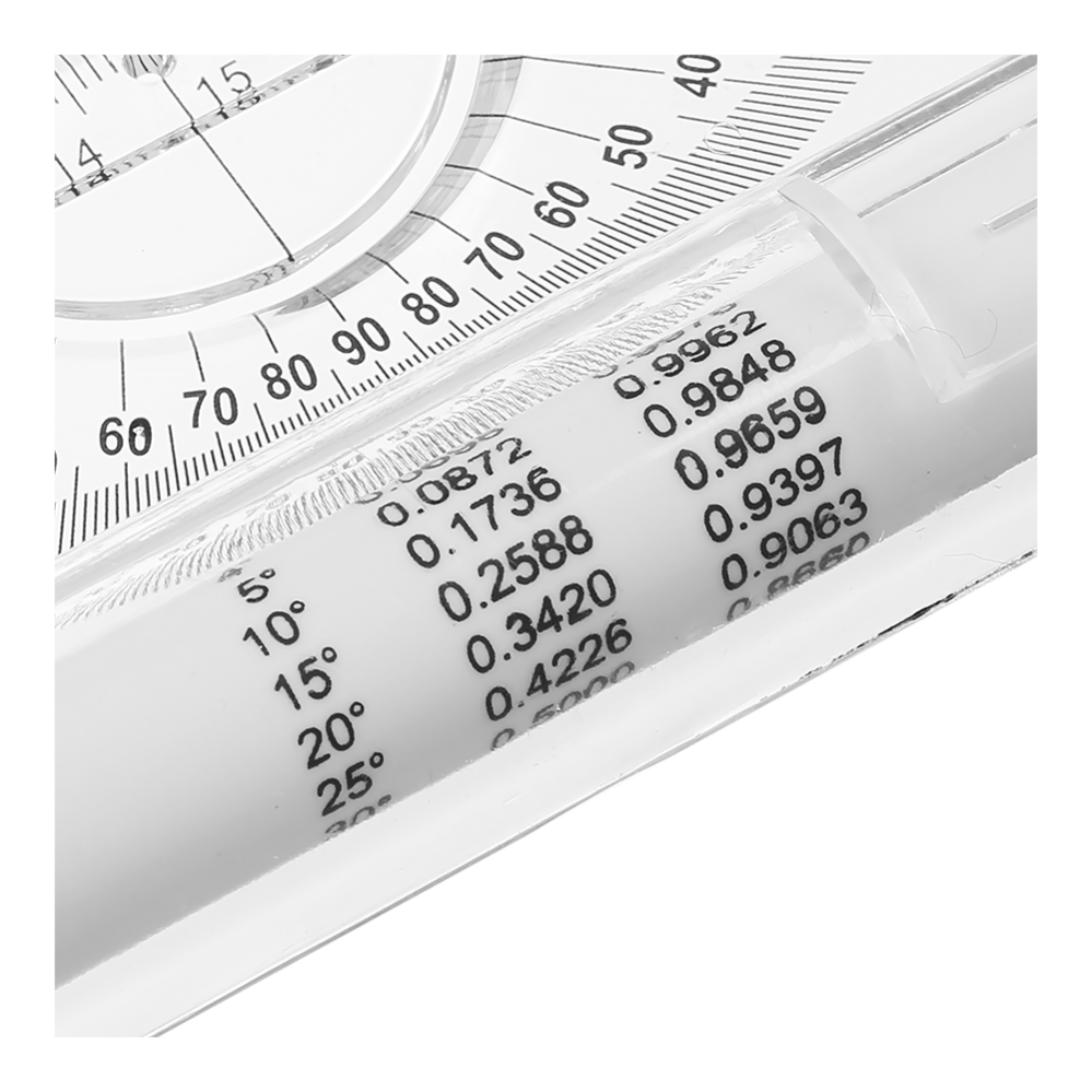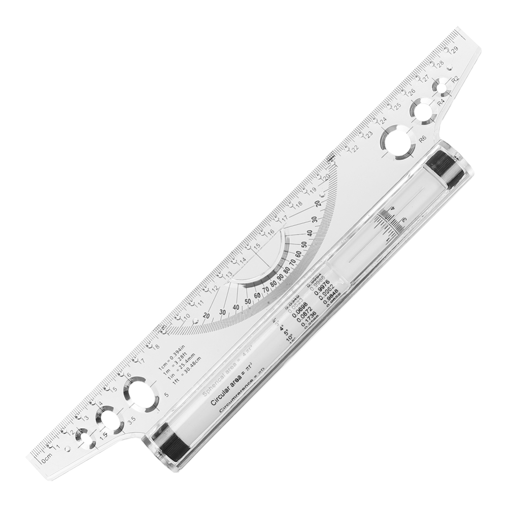 Металевий ролик має прогумовані накладки на кінцях, що запобігають ковзанню лінійки на поверхні. Додатково передбачено вбудований транспортир і трафарети: кола радіусом 2 мм, 4 мм, 6 мм та овали 1,5 мм, 3,5 мм, 5 мм.