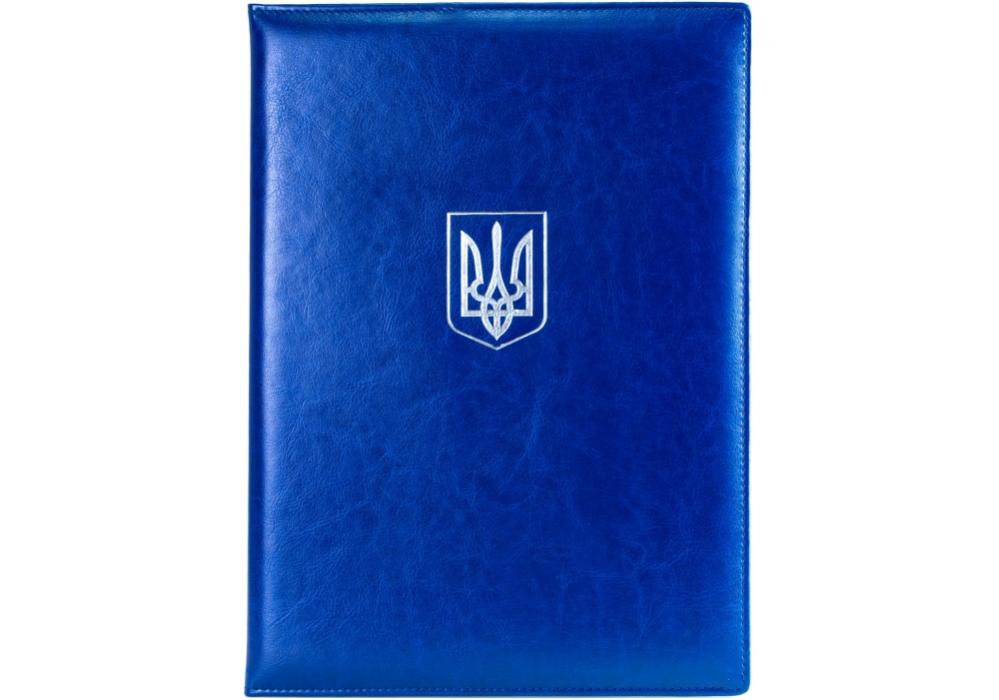 Папка з тисненням «ГЕРБ (тризуб)» серії Nebraska призначена для зберігання та презентації документів. Обкладинка виготовлена зі штучної шкіри синього кольору зі срібним тисненням, що надає виробу офіційного та стриманого вигляду. Внутрішня частина має вклейку з білого паперу для охайного розміщення документів. Папка оснащена стрічкою-тримачем для їх фіксації. Розмір папки — 310x225 мм.