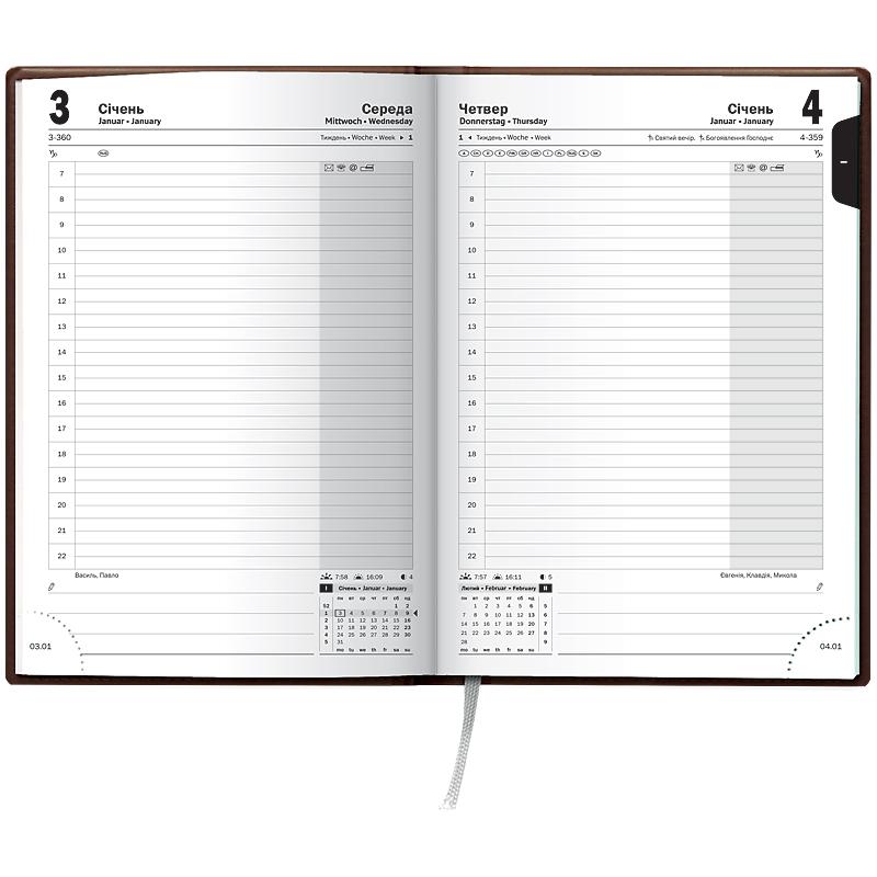 Датована сторінка на кожен день року з організатором часу з 7:00 до 21:00, календарем на поточний/наступний місяць, позначенням дня тижня, знака зодіаку, іменинників.