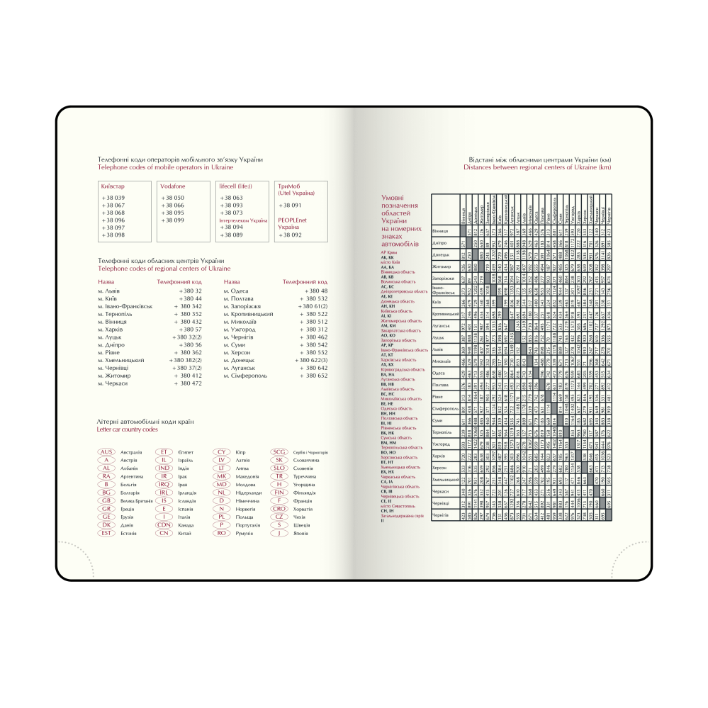 Інформаційно-довідковий блок: національні, релігійні, професійні свята та пам'ятні дати, знаки зодіаку, телефонні коди мобільних операторів та обласних центрів України, літерні автомобільні коди країн, таблиця відстаней між обласними центрами України, довідник систем вимірювання, міжнародні знаки відповідності, знаки догляду за одягом;