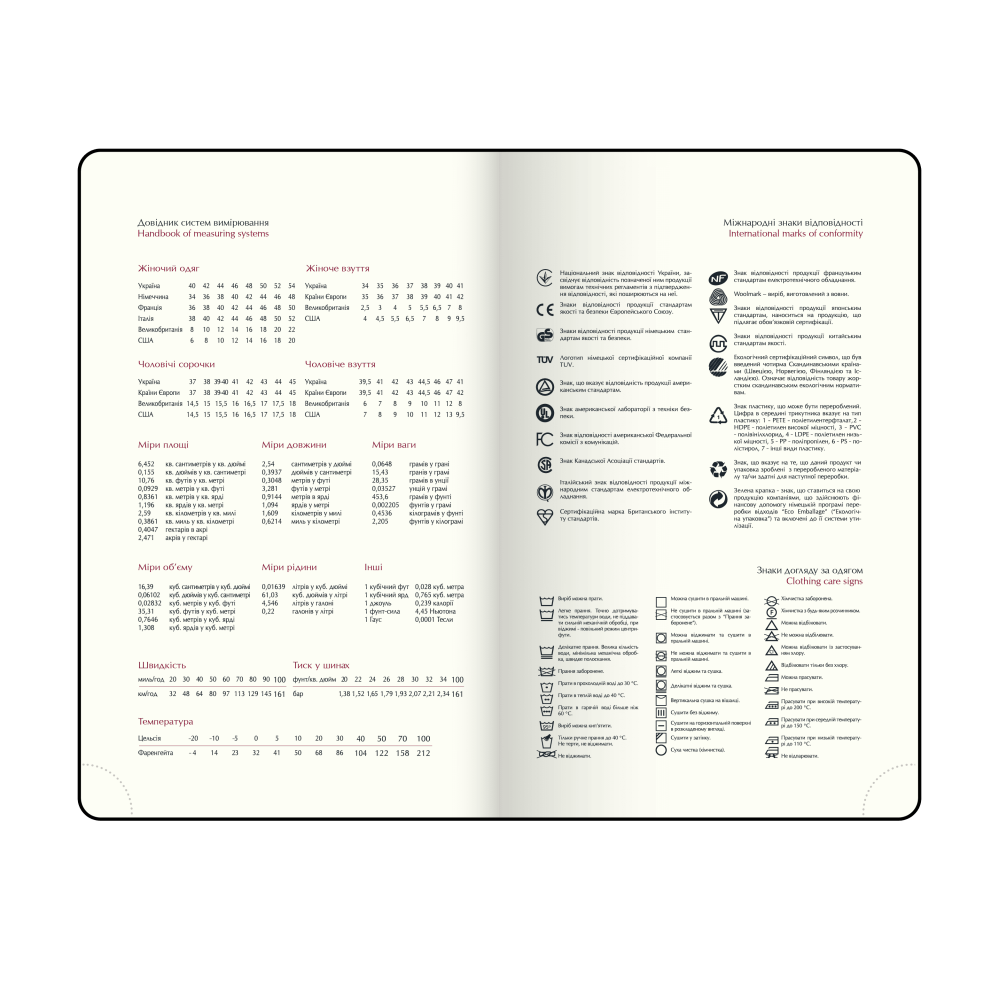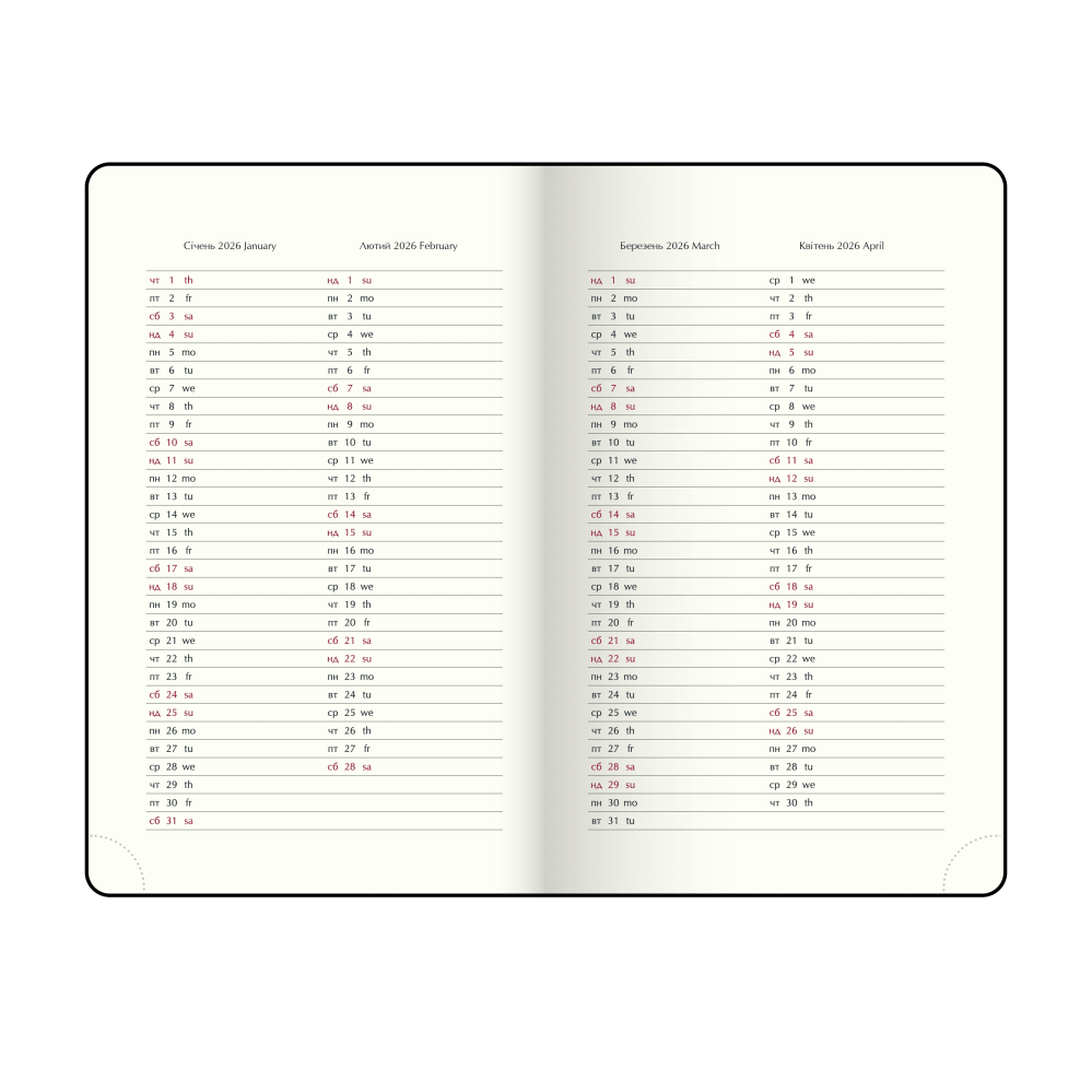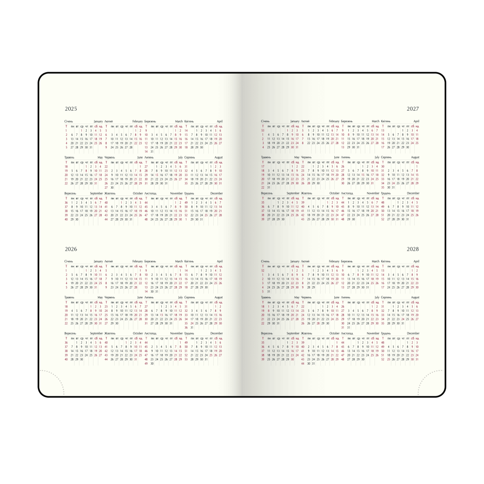 Структура містить: сторінку для особистої інформації, календарі на 2025–2028 роки, планінг на 2026 рік, довідковий розділ (свята, знаки зодіаку, телефонні й автомобільні коди, таблицю відстаней, системи вимірювання, міжнародні знаки відповідності та догляду за одягом), а також датовані сторінки з розкладом часу з 7:00 до 21:00, календарями поточного та наступного місяців, зазначенням дня тижня, знаку зодіаку й іменинників. У кінці є алфавітна книга для контактів.Артикул: BM.2771-01 - Выбрать или купить Щоденники датовані Зріз тонований Всього: 45