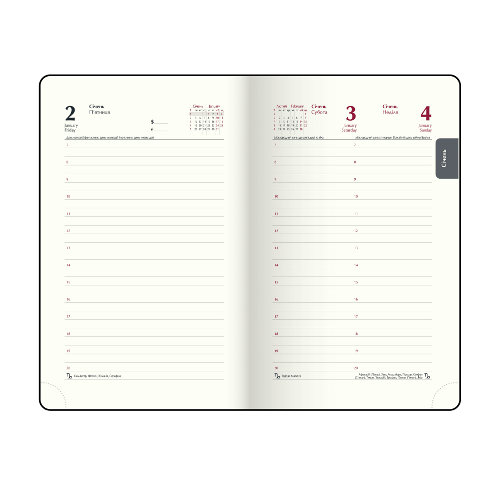 Датована сторінка на кожен день року з організатором часу з 7:00 до 21:00, календарем на поточний/наступний місяць, позначенням дня тижня, знака зодіаку, іменинників