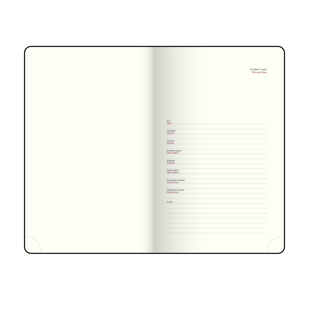 Формат — А4, 336 сторінок. Внутрішній блок виготовлений із кремового офсетного паперу щільністю 70 г/м2, друк у сіро-бордовій гамі. Для зручності є закладка-ляссе в колір обкладинки та перфоровані куточки аркушів. Блок двомовний — українська та англійська. На форзацах розміщені карти України та Європи. Щоденник постачається в індивідуальній картонній коробці.
