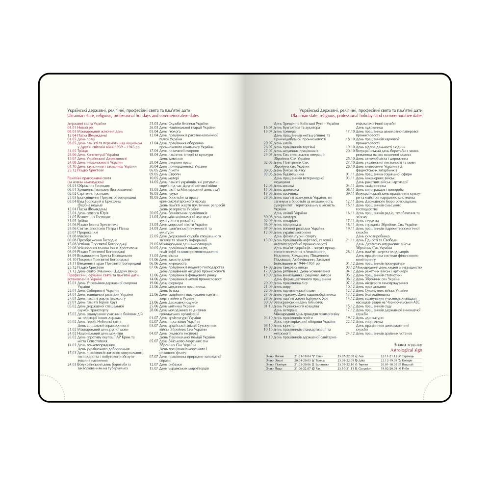 Датована сторінка на кожен день року з організатором часу з 7:00 до 21:00, календарем на поточний/наступний місяць, позначенням дня тижня, знака зодіаку, іменинників.