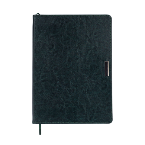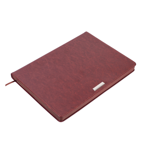 Гнучка обкладинка виготовлена зі штучної шкіри з фактурою під натуральну. Родзинкою дизайну є металевий декоративний елемент — стильна табличка на лицьовій стороні обкладинки. Завершують образ декоративний шов по периметру та тонований зріз внутрішнього блоку в колір обкладинки.