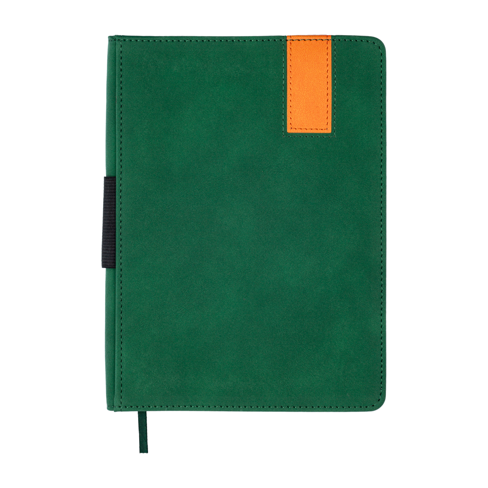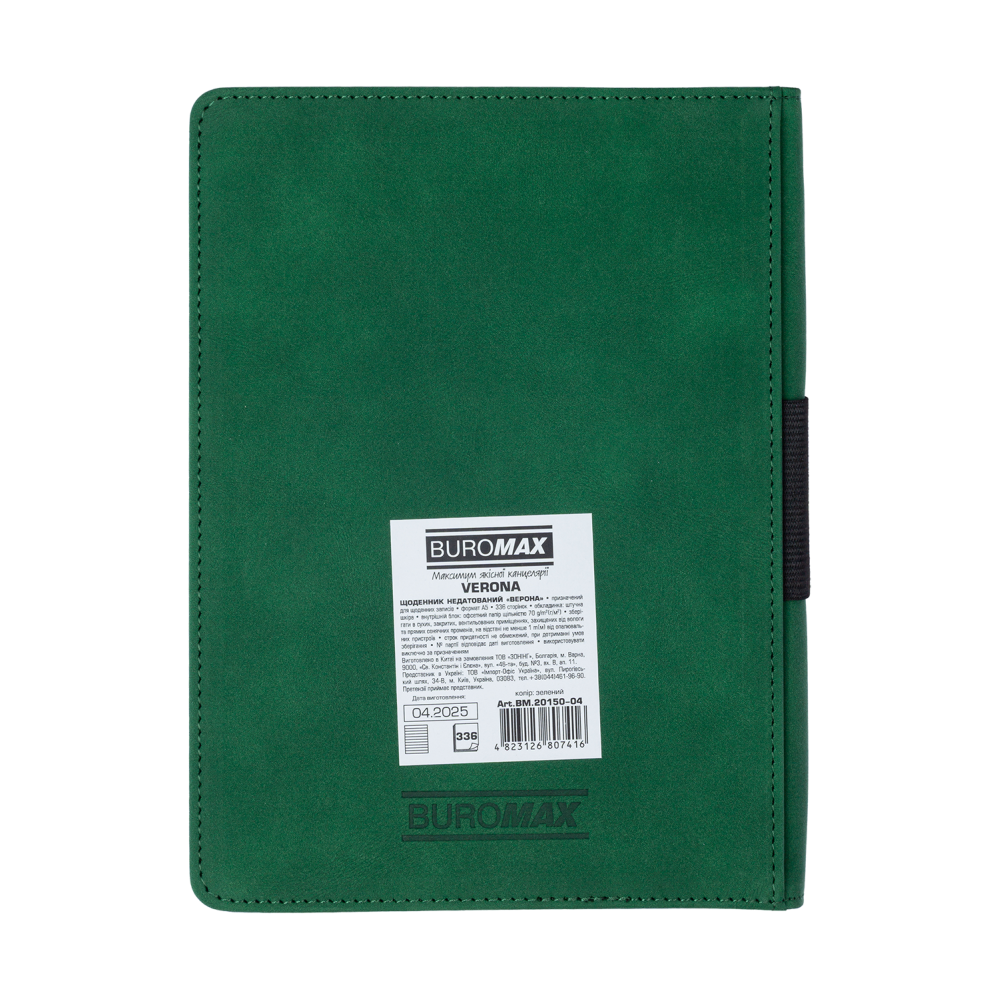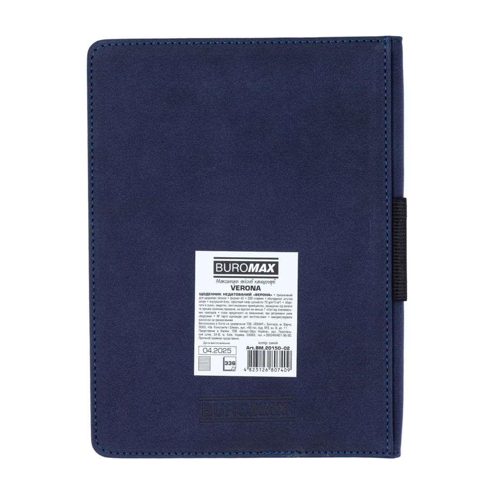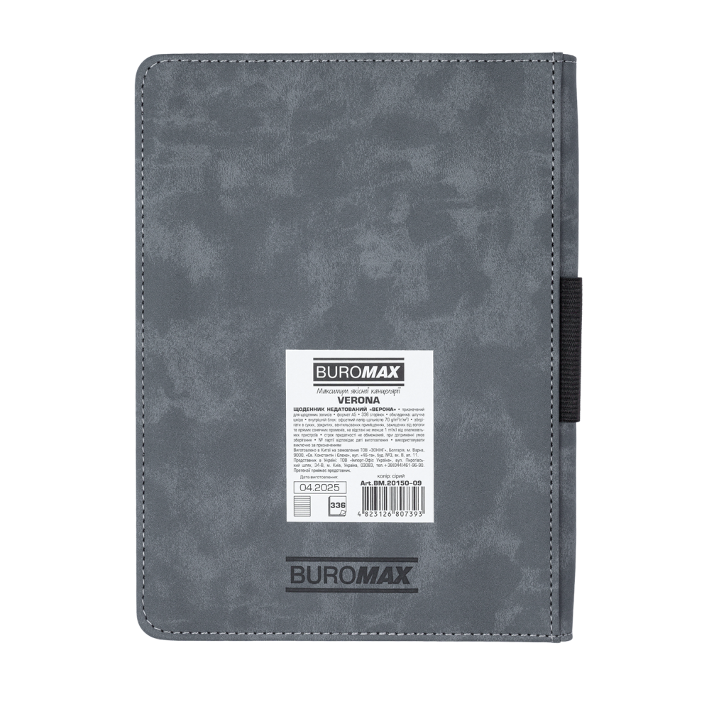 Щоденник BUROMAX VERONA формату А5 має жорстку обкладинку зі штучної шкіри з комбінацією кольорів і фактур. Периметр обкладинки та вставки на лицьовому боці оздоблені декоративними швами, що надає виробу елегантності. На корінці розташована резинка-петелька для ручки — практичний елемент, який дозволяє завжди мати письмове приладдя під рукою. Завершує дизайн тонований у колір обкладинки зріз внутрішнього блоку.