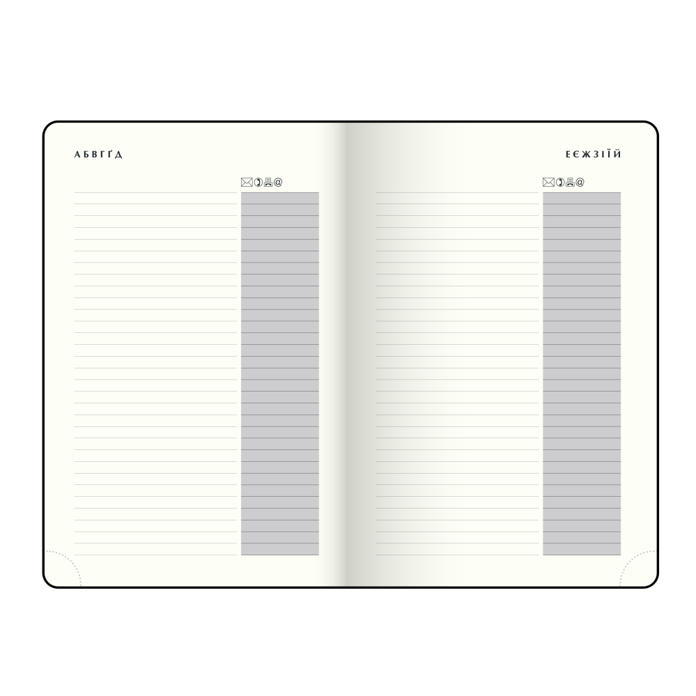 Структура містить: сторінку для особистої інформації, недатовані сторінки в лінію з полем для дати та алфавітну книгу для контактів.Артикул: BM.2019 -