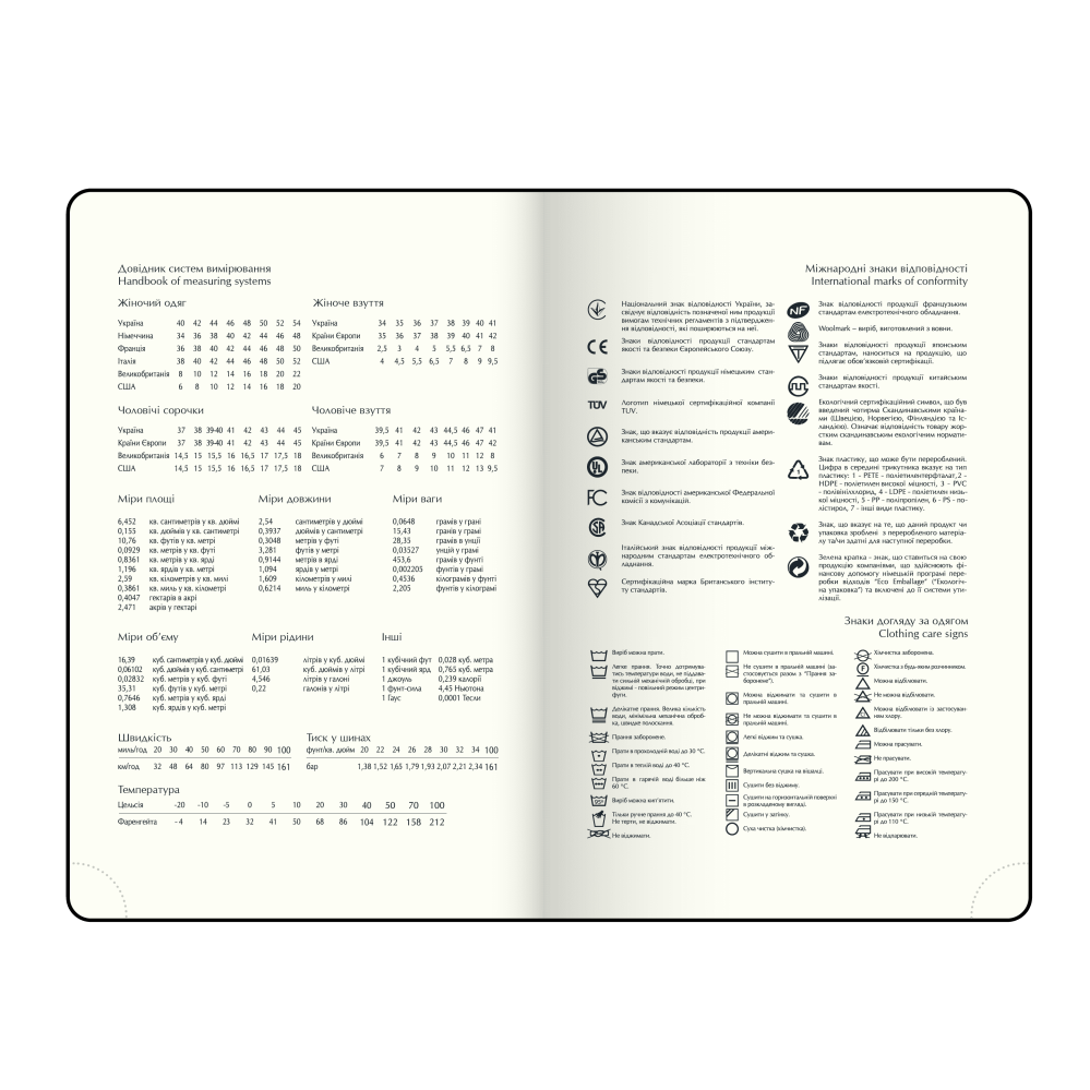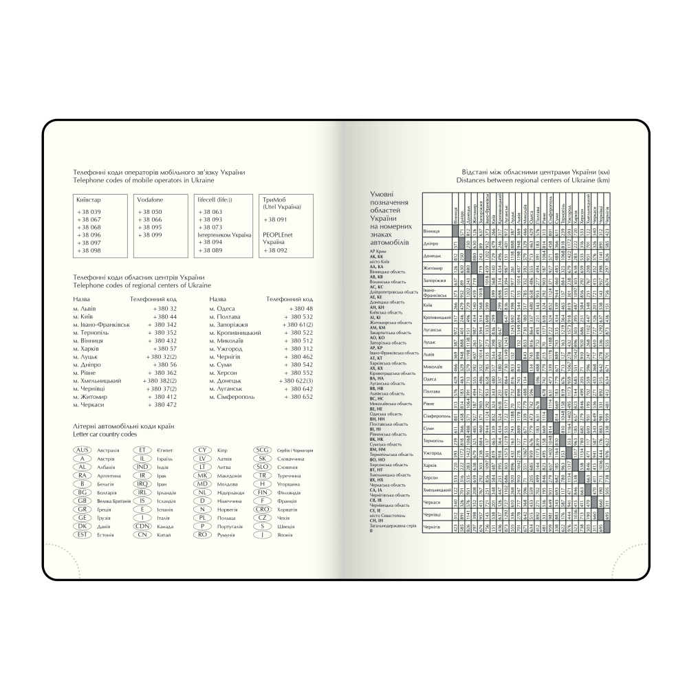 Інформаційно-довідковий блок: телефонні коди мобільних операторів та обласних центрів України, літерні автомобільні коди країн, таблиця відстаней між обласними центрами України, довідник систем виміру, міжнародні знаки відповідності, знаки догляду за одягом;
