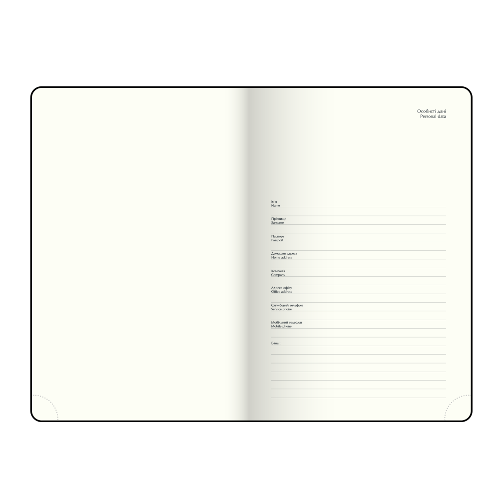 Структура містить: сторінку для особистої інформації, річний планінг, довідковий блок (телефонні коди операторів і обласних центрів України, автомобільні коди країн, таблиця відстаней, системи вимірювання, міжнародні знаки відповідності та знаки догляду за одягом), недатовані сторінки в лінію з полем для дати та алфавітну книгу для контактів.Артикул: BM.20400 -