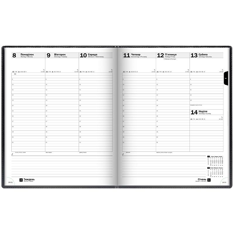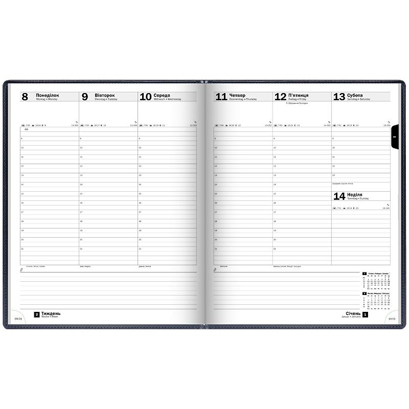 Датована сторінка на кожен день року з організатором часу з 7:00 до 21:00, календарем на поточний/наступний місяць, позначенням дня тижня, знака зодіаку, іменинників.