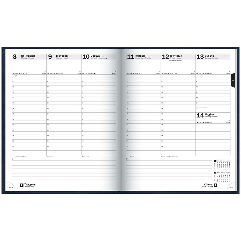 Датована сторінка на кожен день року з організатором часу з 7:00 до 21:00, календарем на поточний/наступний місяць, позначенням дня тижня, знака зодіаку, іменинників.