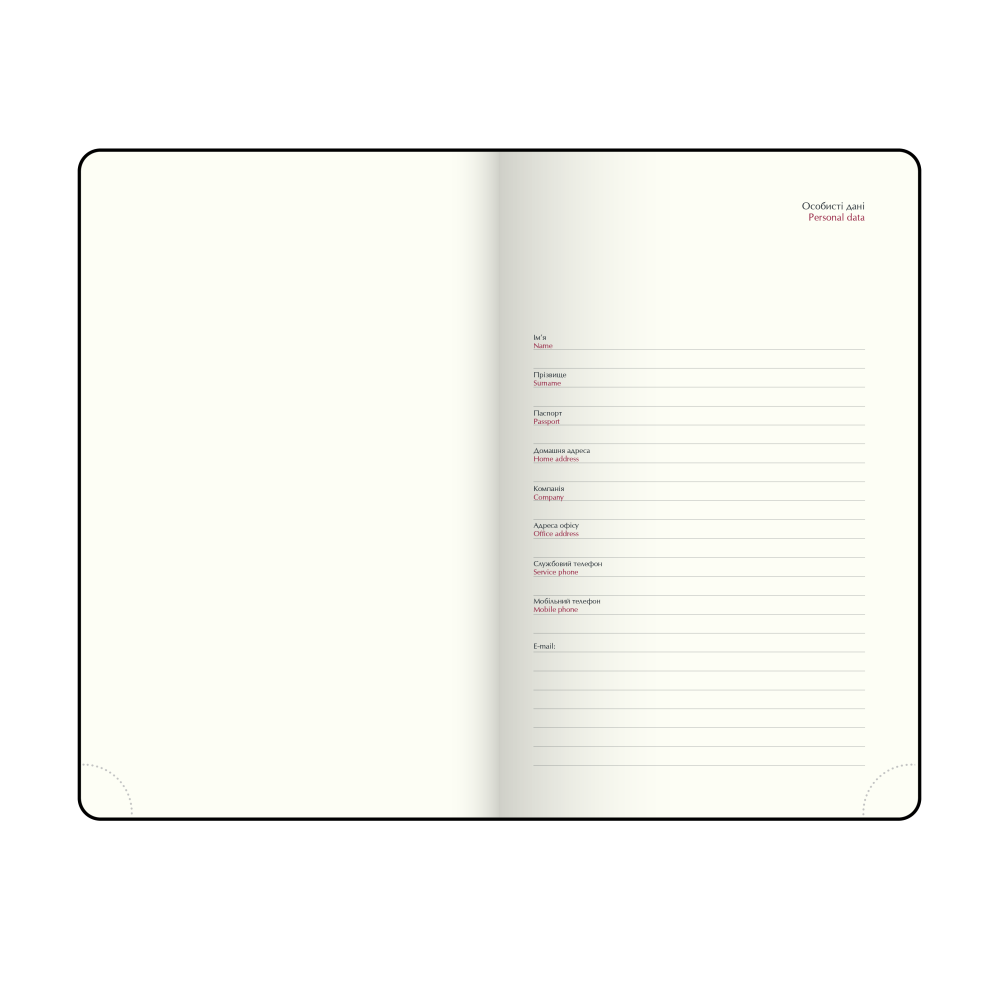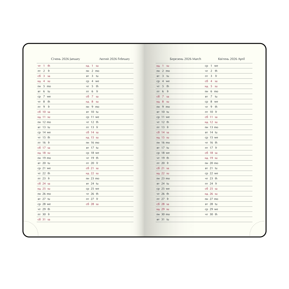 Структура включает два блока: датированный в линейку для планирования и дополнительный в клетку для личных записей. Внутренний блок на украинском языке содержит календарь на 2026–2027 годы, недельное расписание, информацию о праздниках, важные телефонные номера, часовые пояса, единицы измерения и температурную шкалу.