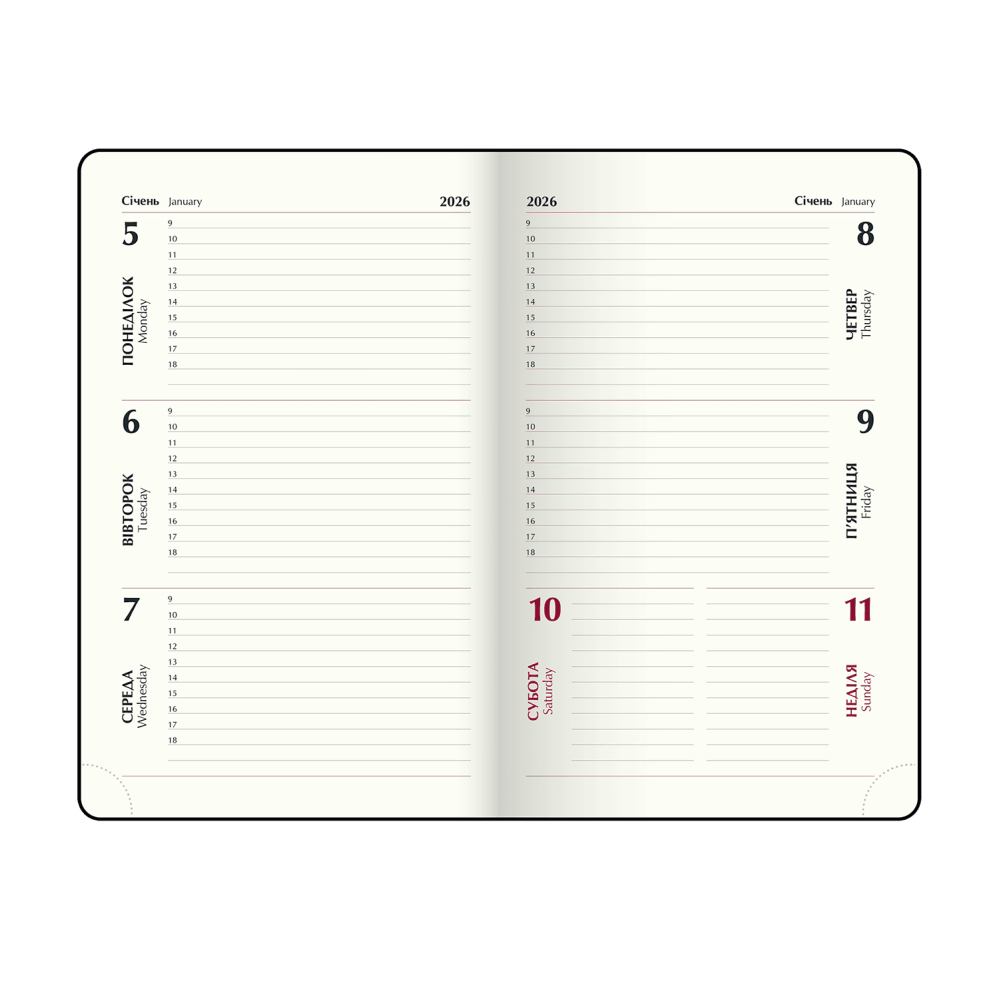 На одній сторінці горизонтально розміщено три/чотири дні тижня (субота та неділя - вертикальне розташування на одній частині), з організатором часу з 9:00 до 18:00, зазначенням місяця, року, дня тижня та дати;