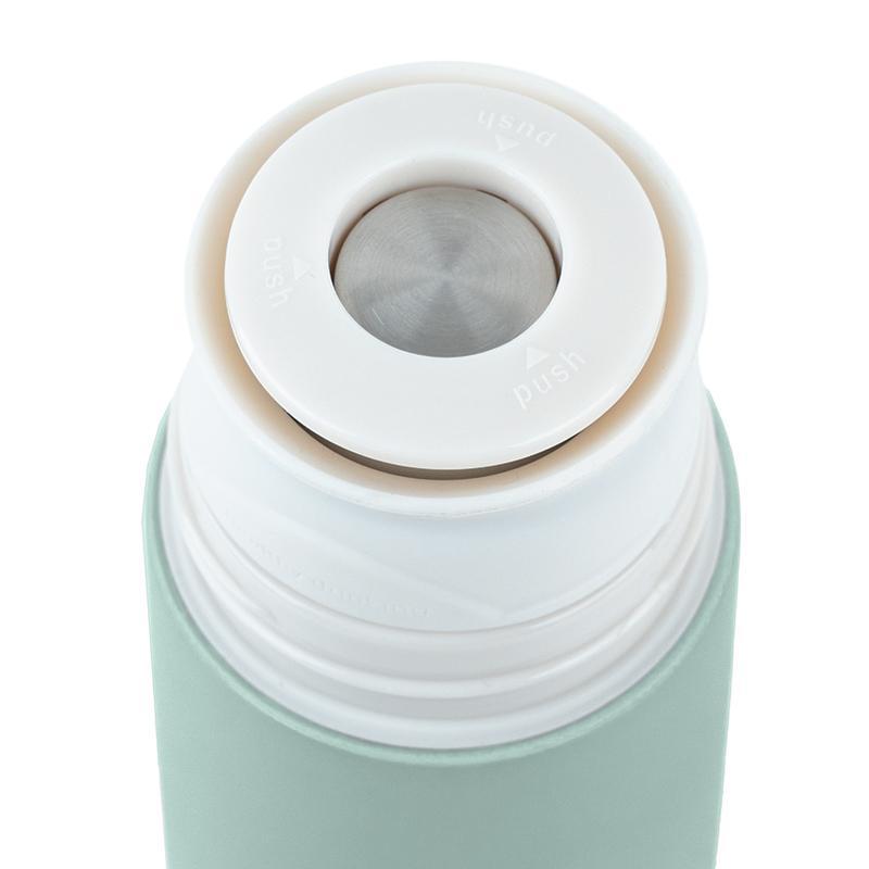 Виготовлений з безпечної та довговічної нержавіючої сталі AISI 304, яка не впливає на смак. Термос оснащений клапаном для наливання (відкриття одним натисканням) і кришкою-чашкою з ручкою, яку можна використовувати як кухоль. Лаконічний дизайн універсальний, а зовнішнє пластикове покриття кришки приємне на дотик і не нагрівається. Для безпечного використання не рекомендується наливати окріп або відразу щільно закривати кришку.